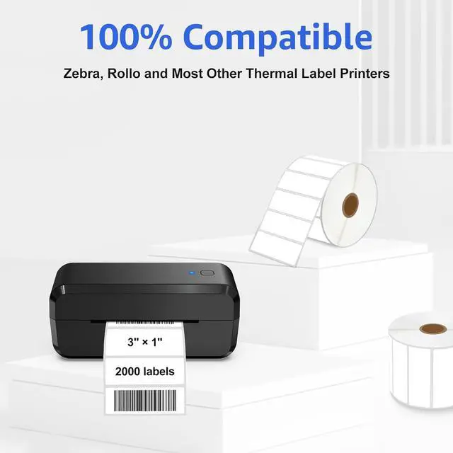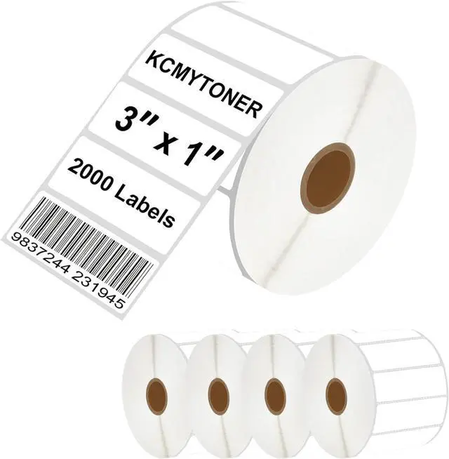 Package Includes: 5 rolls KCMYTONER 3 in x 1 in (1" core) multipurpose thermal direct paper labels, 2000 labels per roll, with perforated design between labels for easier separation