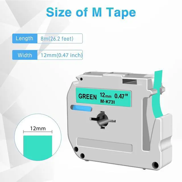 Product InformationEsaytool 20 Pack Compatible with P-touch M-K731 MK731 M731 Labeling Tape; Color: Black Print on Green Text; Width:0.47 inch(12mm), Length:26.2 feet(8m).