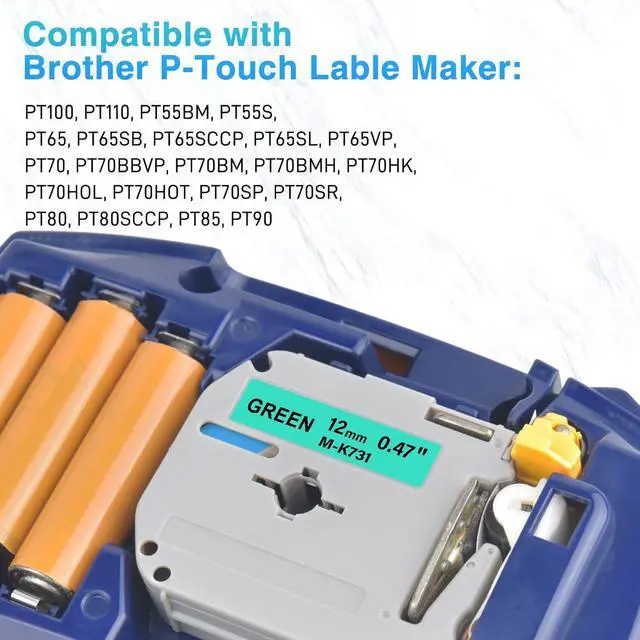 CompatibilityCompatible for brother p-touch label makers: PT100, PT110, PT55BM, PT55S, PT65, PT65SB, PT65SCCP, PT65SL, PT65VP, PT70, PT70BBVP, PT70BM, PT70BMH, PT70HK, PT70HOL, PT70HOT, PT70SP, PT70SR, PT80, PT80SCCP, PT85, PT90Notice: Compatible ptouch m tape is smaller than tze tape and not compatible for ptouch tze label makers, such as pt-d210/pt-h110/pt-d400/pt-d600...
