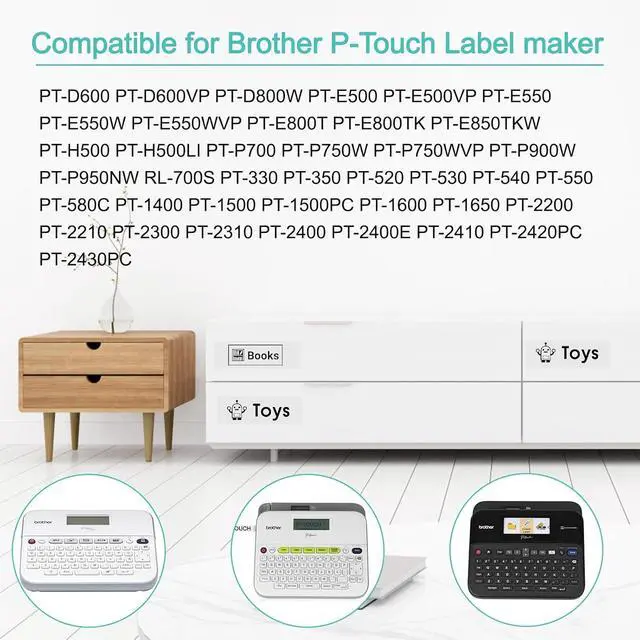 Compatible for brother p-touch label makers: PTD600 PTD610BT PTP710BT PTP750W PTE500 PTE550W PTE800W PTH500LI PTP700 PTP900W PTP950W PT330 PT350 PT520 PT530 PT540 PT550 PT580C PT1400 PT1500PC PT1600 PT1650 PT2200 PT2210 PT2300