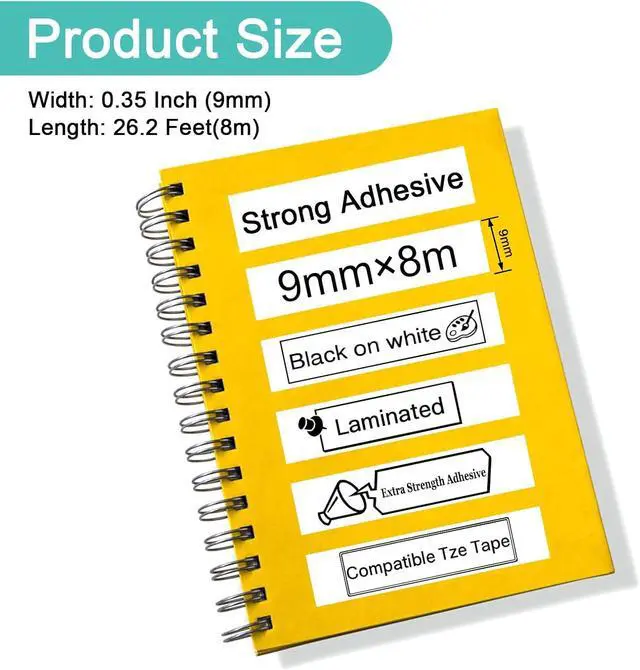 Color: black on white; Size: 3/8 inch (9mm) x 26.2 feet (8m). Compatible tze tape 9mm print White and natural, easy to peel and use, make your things all be tidy and clean at a glance.