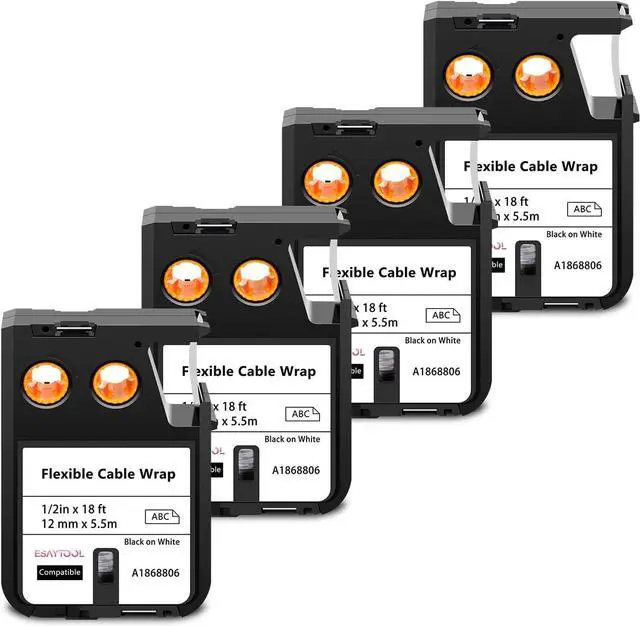 Product InformationEsaytool 4 Pack Compatible with Dymo Flexible Cable Wrap 1868806 A1868806 Labeling Tape; Color: Black Print on White Text; Width:0.47 inch(12mm), Length:18 Feet(5.5m).