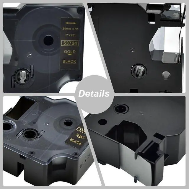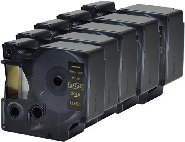 Color & Dimesion:D1 dymo label tape color:Gold print on black;Size:1 inch (24mm) widthx23 feet(7m)length,d1 dymo tape comes in a variety of colors and sizes.5rolls labeling tape packed in a box