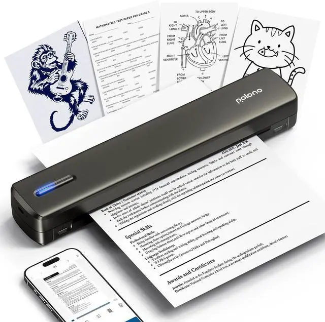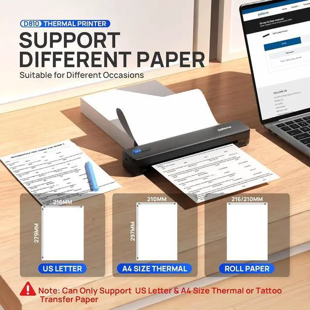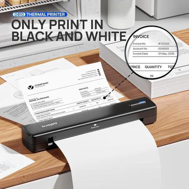 Portable PrinterPOLONO portable printer is small in size and weighs only 1.17 pounds. This portable design allows you to print wherever you need. Whether it's in your car, backpack, or during business travel, D810 bluethooth thermal printer is your reliable companion for office documents, inventory lists, business checks and more