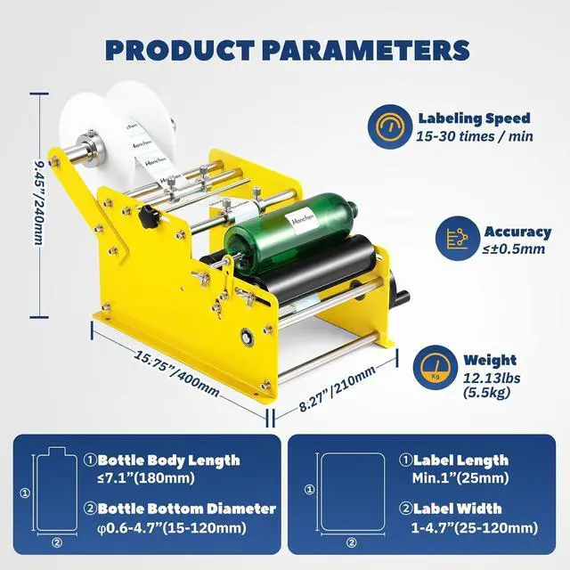 VERSATILE COMPATIBILITY: This bottle labeler is adjustable, it can meet the cylindrical labeling of diameter 15-120mm(0.59-4.72), with high labeling accuracy: the deviation between the head and the end of the label is ±0.5mm/0.02in. Precise positioning, neat and flat, with no wrinkles or bubbles. Whether you're labeling jars, packages, or products of various sizes, our labeler accommodates a wide range of label rolls. Adjustable mechanisms ensure a perfect fit for your specific labeling needs.