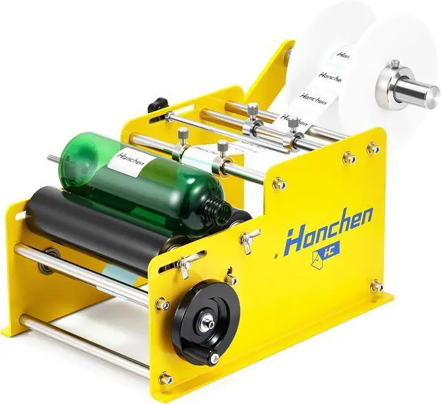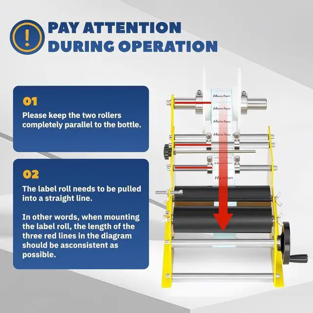 DURABLE & RELIABLE: Built to withstand the rigors of daily use, this bottle labeling machine is crafted from high-quality materials and features a bright yellow paint job. Its robust construction guarantees long-lasting performance, ensuring you get the most out of your investment. Also it is easy to install and packed with complete accessories, just be sure to have two rollers parallel to the bottle and the label roll in a straight line, otherwise the label will be crooked.