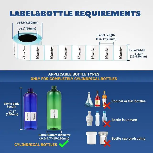 ADJUSTABLE MECHANISMS: This labeling machine is with two rollers and a positioning screw, with forward and backward roller adjustment, suitable for round bottles of different sizes. Roller length: 7.1(180mm), please make sure that the bottle body length 7.1(180mm). The positioning screw is used to fix the bottom of the bottle, and can be removed when labeling large diameter bottles. Note that the two rollers and the bottle need to be kept parallel.
