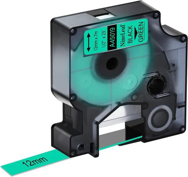 Color: black on green; Size: 1/2 inch (12mm) x 23 feet (7m). Resistant to water, chemical, fade, temperature and UV.