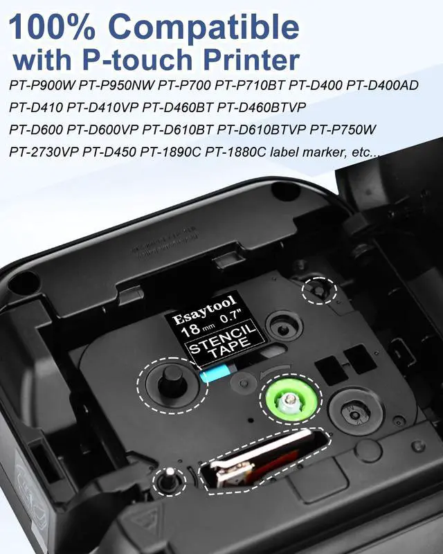 CompatibilityCompatible for label makers:PT-P900W PT-P950NW PT-P700 PT-P710BT PT-D400 PT-D400AD PT-D410 PT-D410VP PT-D460BT PT-D460BTVP PT-D600 PT-D600VP PT-D610BT PT-D610BTVP PT-P750W PT-2730VP PT-D450 PT-1890C PT-1880C PT-1880 PT-H500LI PT-2730 PT-2430PC PT-2300 PT-2030 PT-2030AD PT-2030VP PT-2100 PT-2110 PT-2200 PT-2210 PT-2300 PT-2310 PT-2400 PT-2410 PT-2430PC and more printers.