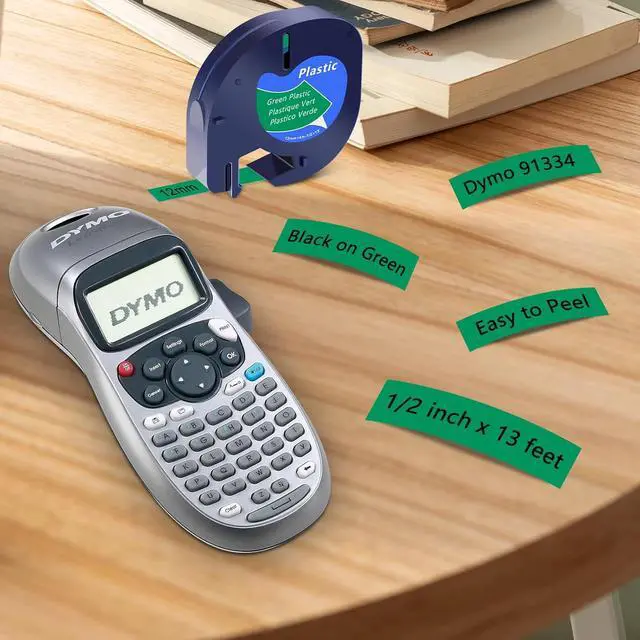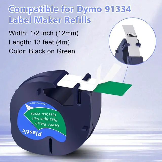 Package includes: 40 pack KCMYTONER compatible for dymo letra tag refills plastic 91334 S0721640 label maker tape. Color: black ink on green tape. Width: 1/2 inch (12mm), length: 13 feet (4m)