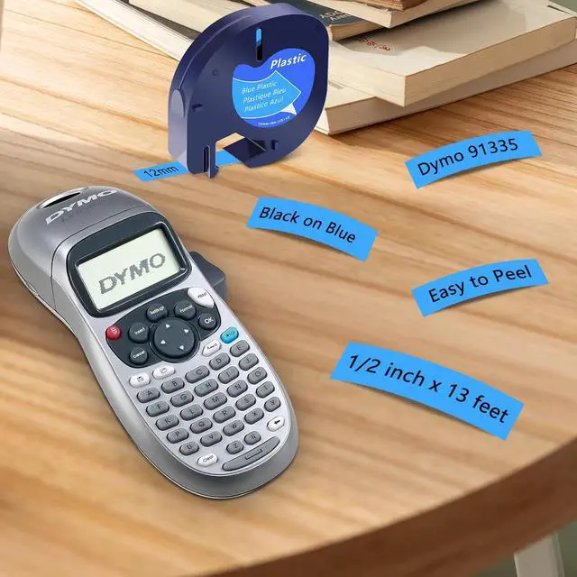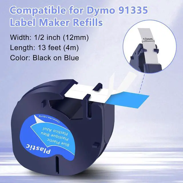 Package includes: 40 pack KCMYTONER compatible for dymo letra tag refills plastic 91335 S0721650 label maker tape. Color: black ink on blue tape. Width: 1/2 inch (12mm), length: 13 feet (4m)