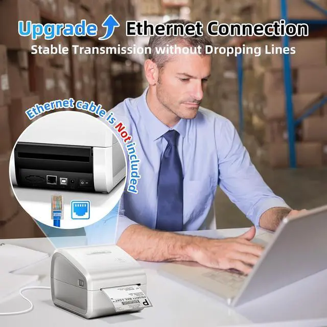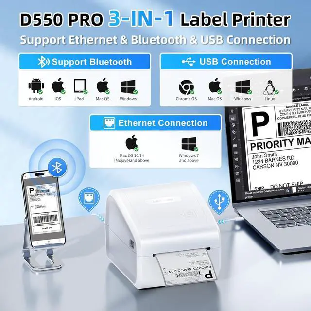 [3-IN-1 Ethernet Label Printer] - We made it! In addition to Bluetooth and USB, D550 Pro shipping label printer also supports Ethernet connection printing, can print labels anytime, anywhere from Win/MacOS computer on the same LAN! Besides, Ethernet printing ensures stable file transfers, no more worrying about print drops. Undoubtedly, Our thermal label printer can help your business grow faster and work more efficiently