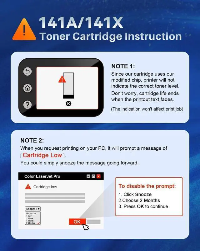 Package Content:1 x User Guide, 2 x hp 141A Black High Yield toner cartridge(with chip)