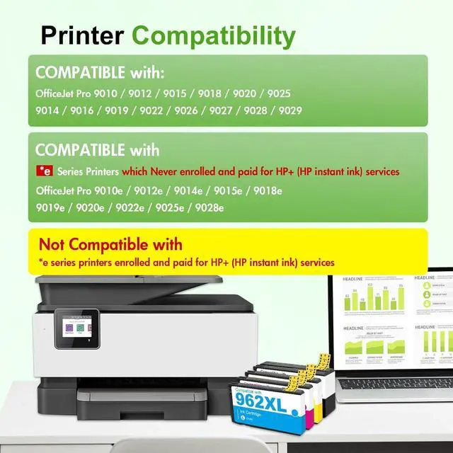 Compatible Printers: 962XL/962 Ink Cartridges Combo Pack compatible for *e series printers which Never enrolled and paid for HP+ services, such as OfficeJet Pro 9015e 9018e 9025e 9010e 9012e 9014e 9019e 9020e 9022e 9028e Printer