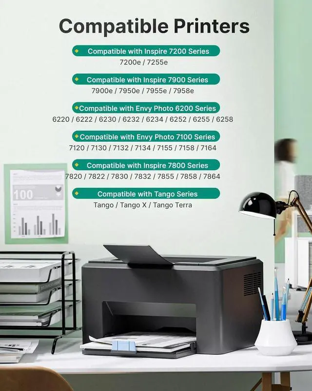 This replacement ink for hp 64 black ink cartridge works for HP Envy Photo 7800 Series: 7800, 7820, 7822, 7830, 7832, 7855, 7858, 7864; Tango Series: Tango, Tango X, Tango Terra Printer - Reliable replacement.
