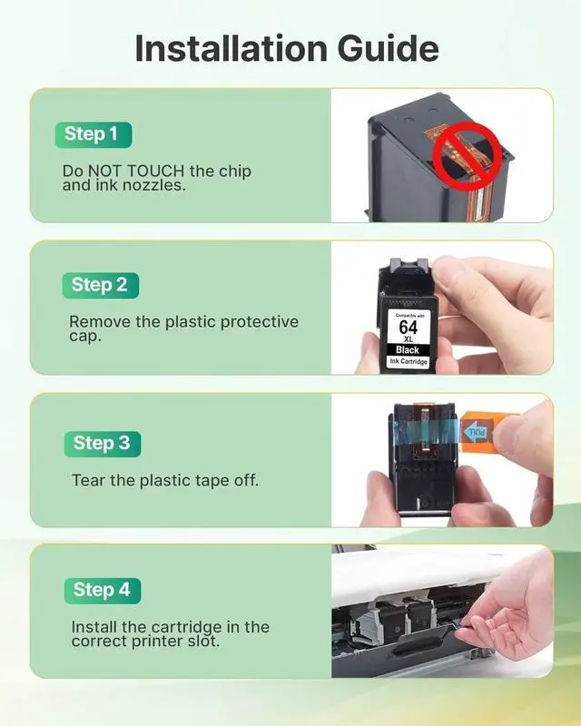 This replacement ink for hp 64xl black ink cartridge works for HP ENVY Inspire 7200, 7200e, 7255e, 7900, 7900e, 7950e, 7955e, 7958e; ENVY Photo 6200 Series: 6200, 6220, 6222, 6230, 6232, 6234, 6252, 6255, 6258; Envy Photo 7100 Series: 7120, 7130, 7132, 7134, 7155, 7158, 7164 Printer - Precise fit, guaranteed performance.