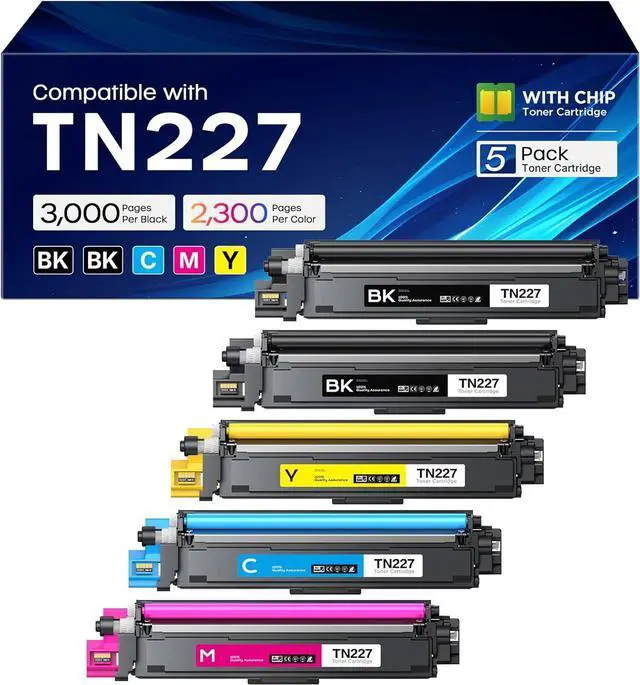 Package Content: 2 x Black Compatible TN 227, 1 x Cyan Compatible TN227, 1 x Magenta Compatible TN227, 1 x Yellow Compatible TN227Y, 1 x User Guideline (Total 5 Pack Compatible TN227 Toner cartridges with chip; This is TN227 Toner Cartridge ONLY. Drum unit is NOT included. Please confirm your needs before purchasing)