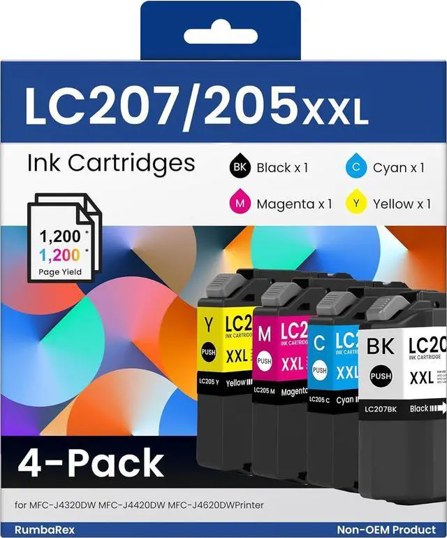 The Package Contains: LC207 LC205 XXL Ink Cartridges 4-Pack (1x LC207BK Black Ink Cartridge, 1x LC205C Cyan Ink Cartridge, 1x LC205M Magenta Ink Cartridge, 1x LC205Y Yellow Ink Cartridge)
