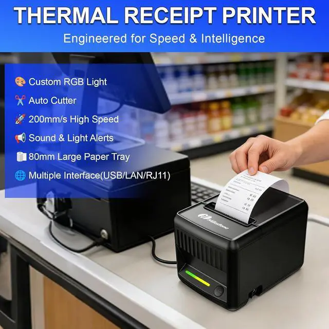 Built for Speed & Durability: Handle Any RushEngineered to keep up with peak-hour demand, this pos printer delivers 200mm/s high-speed printing and 203DPI resolution for crisp text and perfectly scannable barcodes. Built to last, it features a print head lifespan 150km and a 1.5 million-cycle auto steel cutter, with high-temperature protection ensuring reliable, sustained performance in any high-volume environment.