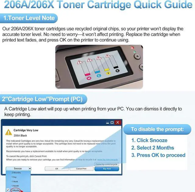 With The Latest Chip: 206A W2110A toner cartridge replacement for hp 206A toner cartridges 4 pack set contain the latest chips, no need to transfer 206A or 206X toner chip
