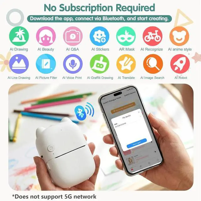 Extra Tech Spec: User-Friendly App with Infinite Templates Beyond AI generation, the App is loaded with massive libraries of themes, fonts, and templates. It functions as a versatile label maker and photo printer for printing retro-style photos, to-do lists, and web pages. A multifunctional small printer that grows with your childs needs.