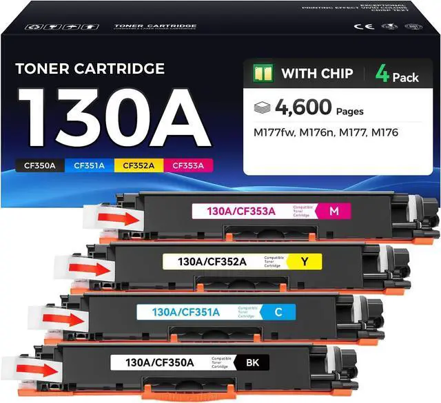 Package Contains: 4 Packs toner cartridges (130A CF350A Black / 130A CF351A Cyan / 130A CF352A Yellow / 130A CF353A Magenta).