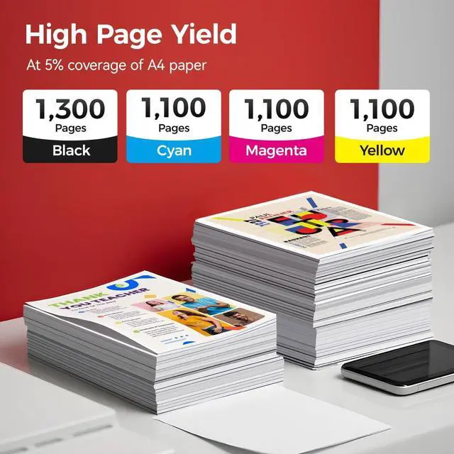 High Page Yield: Up to 1,300 pages per black toner cartridge and 1,100 pages per color toner cartridge at 5% coverage.