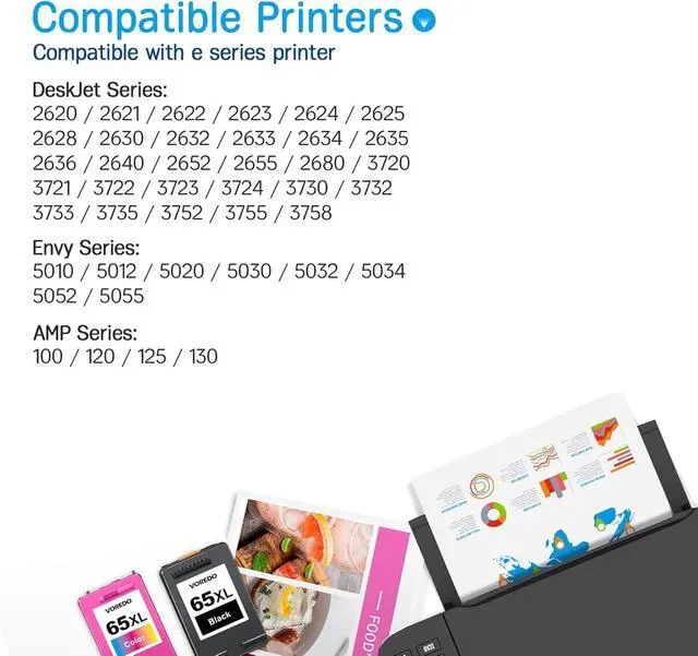 65XL ink Cartridge for HP Printers: Deskjet 3700 Series: Deskjet 3755 3758 3720 3721 3722 3730 3732 3752 3772 Deskjet 2600 Series: Deskjet 2622 2624 2625 2628 2635 2636 2640 2652 2655 2680 ENVY 5000 Series: ENVY 5055, ENVY 5052, ENVY 5058, ENVY 5010, ENVY 5012, ENVY 5014, ENVY 5020, ENVY 5030, ENVY 5032, ENVY 5034, ENVY 5070 AMP Series: AMP 100, AMP 105, AMP 120, AMP 125, AMP 130