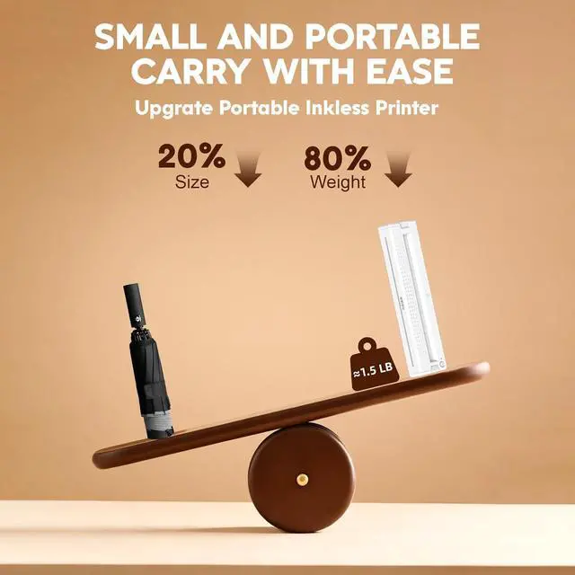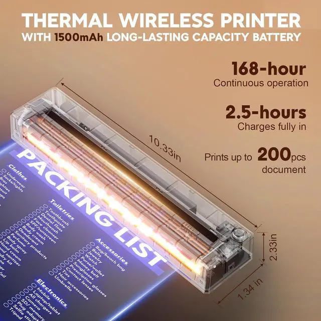 Ultra-Portable & Long-Lasting BatteryMeets all your printing needs for all-day business trips, school homework, and outdoor travel print contracts, invoices, and boarding passes anytime, anywhere, no more rushing to find a print shop! 1.5lbs Ultra-Light Body + Compact 1.3×2.3×10.3 Inches Size easily slips into backpacks/briefcases! The top pick for a portable wireless thermal printer for travel! Built-in 1500mAh rechargeable battery delivers up to 160 prints of 8.5"×11" (A4/US Letter) thermal paper on a full charge.