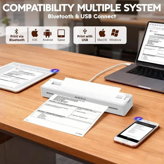 Bluetooth & USB-C ConnectivityUniversal Device Compatibility, Effortless Pairing Even for Beginners! Works as a Bluetooth printer for iPhone & Android (DocPrinter App required for Bluetooth connection) pair with phones/tablets in seconds for wireless printing. Equipped with a built-in USB-C port, its also compatible with Windows (7+) and macOS laptops/desktops (driver required for setup). Eliminates all device compatibility headaches, delivering a seamless printing experience for both mobile office (phone) and home office (computer) use!