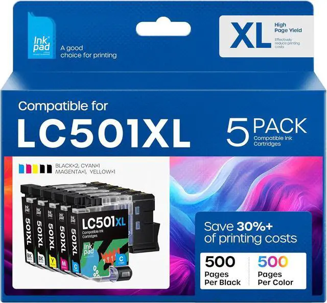 Packing List:This set includes 5 non-OEM ink cartridges: Black LC501XL BK*2, Cyan LC501XL C, Magenta LC501XL M, and Yellow LC501XL Y, designed for printer refilling.