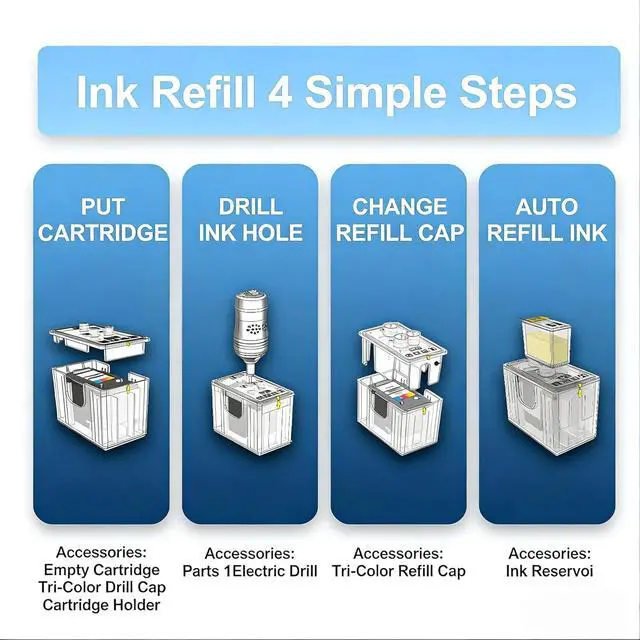 Complete Set: This package includes 3x Black, 2x Cyan, 2x Magenta, 2x Yellow, Additional Accessories: 1x Cartridge Holder, 1x Black Drill Cap, 1x Tri-color Drill Cap, 1x USB-Powered Drilling Tool, 1x Pair of Cleaning Gloves, 1x User Manual, Note: Please scan the QR code or read the manual before refilling to ensure proper usage.