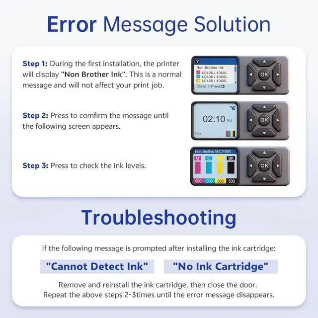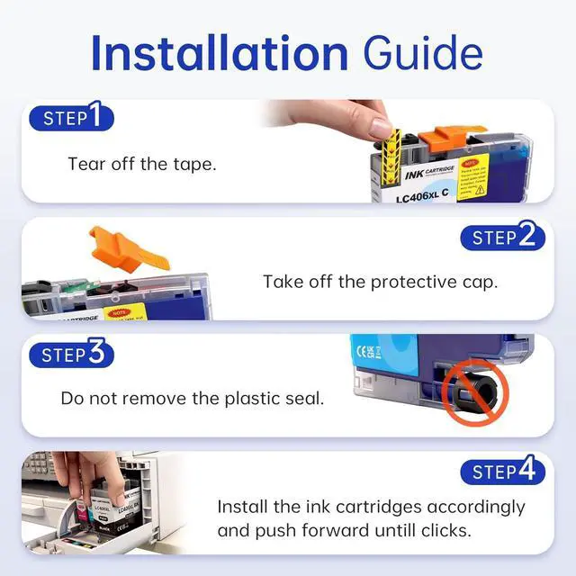 Easy Installation & Tips:Don't remove or touch the chip click "OK/Next" if a "non-original" warning appears and reinstall the cartridge If you see low ink messages, this high-quality non-OEM ink cartridge is fully compatible with Brother LC406XL/LC406 printers