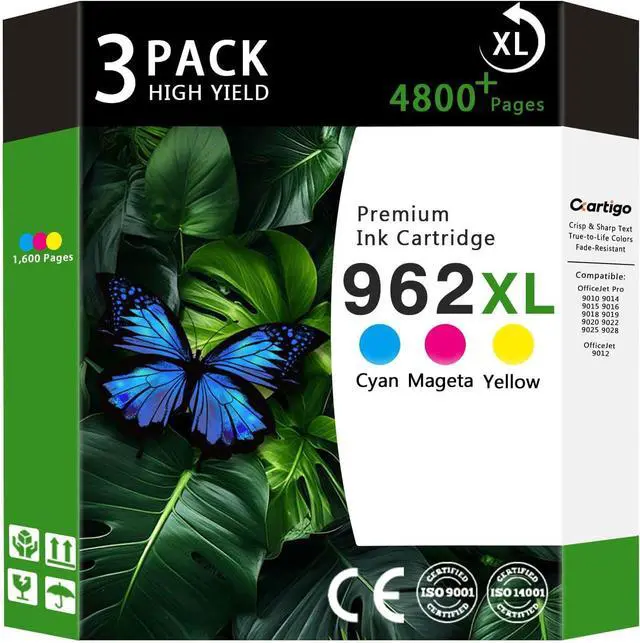 Package Contents: 3 Pack 962XL Ink Cartridges, 1 x Cyan 962XL Ink, 1 x Magenta 962XL Ink, 1 x Yellow 962XL Ink (Non-OEM)