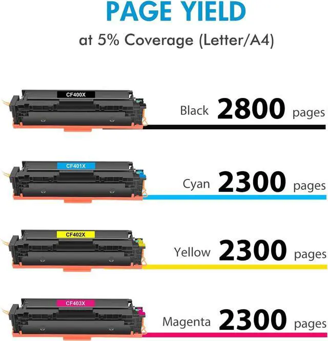 Page Yield: 2,800 pages (Black) and 2,300 pages (C/M/Y) at 5% coverage (Letter/A4) Compatible for 201A Toner Cartridges