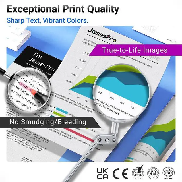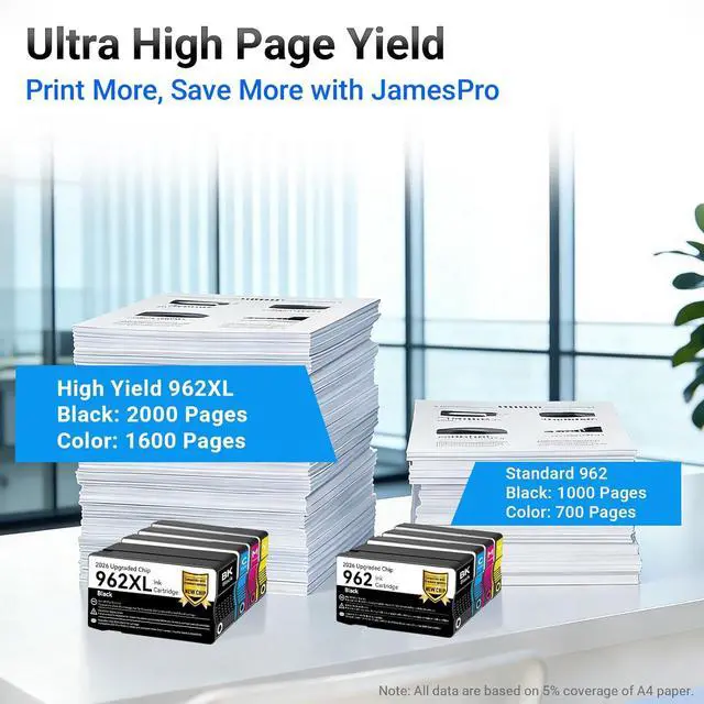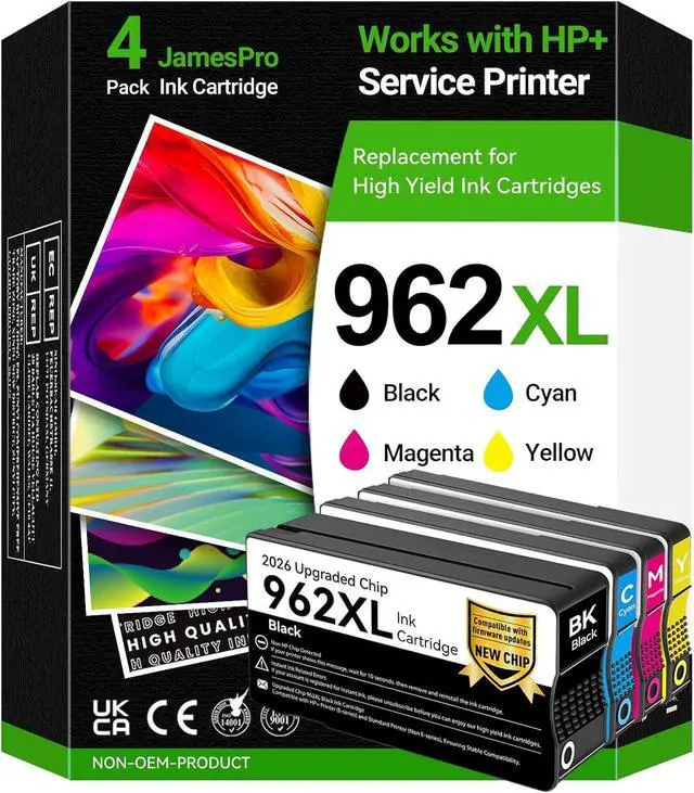 Package Contents: JamesPro 962XL ink cartridges (1 black 1 cyan 1 magenta 1 yellow), compatile for HP 962XL ink cartridges combo pack