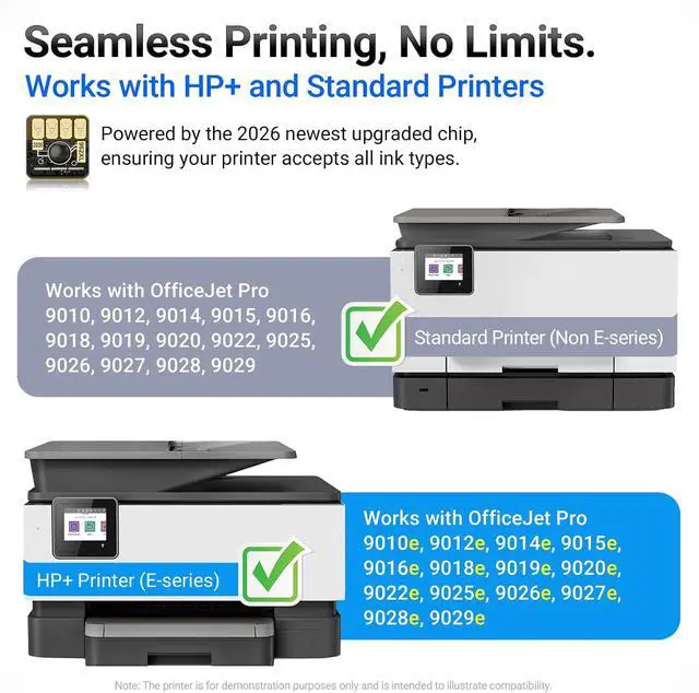 Upgraded Chip: Works with HP+ service printers (models ending in 'e') and standard printers, incompatible with instant ink
