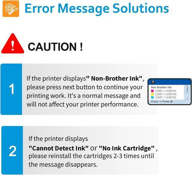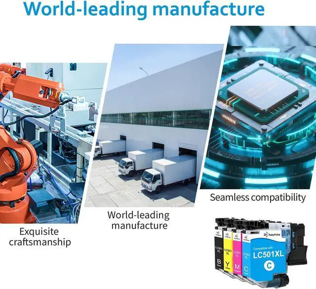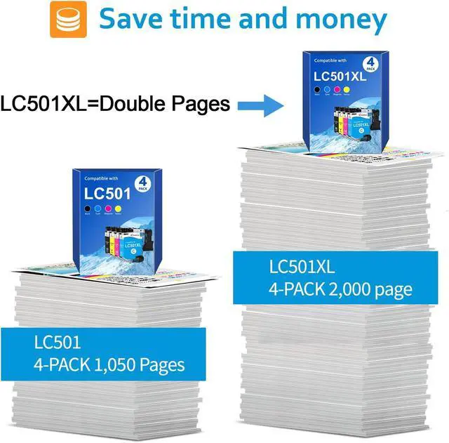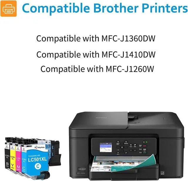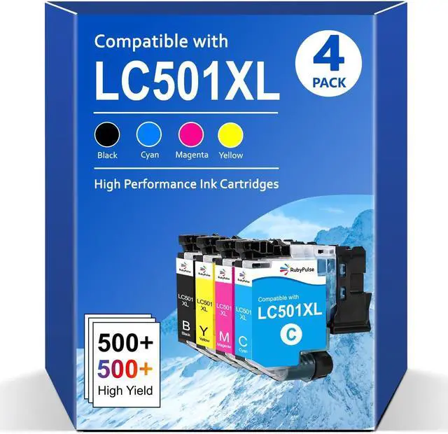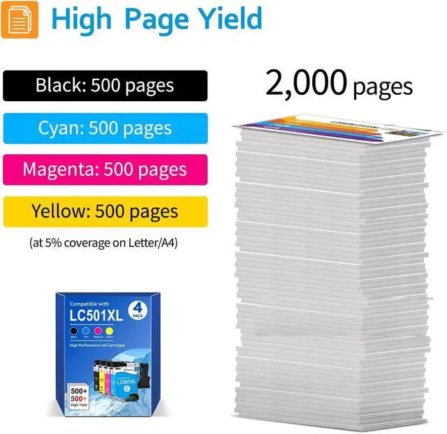 Package Items: 4-Pack 1*LC501XL Black, 1*LC501XL Cyan, 1*LC501XL Magenta , 1* LC501XL Yellow. Replacement for brother LC501XL LC501 ink cartridges. Work with Printers: Compatible with Brother MFC-J1360DW MFC-J1410DW MFC-J1260W printers. High Page Yield: Up to 500 pages per LC501XL black cartridge, and 500 pages per LC501XL color ink cartridge (based on 5% coverage of Letter / A4 size paper).