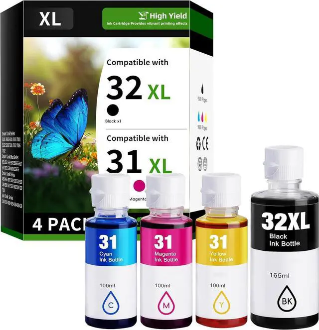 Content Packing: 31 32XL 4 Pack High Yield Color Ink Bottle Replacement Compatible with HP 31 Ink 32XL Black Ink Bottle Set Ink Bottle Combo Pack (1 x Black 32XL Ink Bottle, 1 x Cyan 31 Ink Bottle, 1 x Yellow 31 Ink Bottle, 1 x Magenta 31 Ink Bottle)