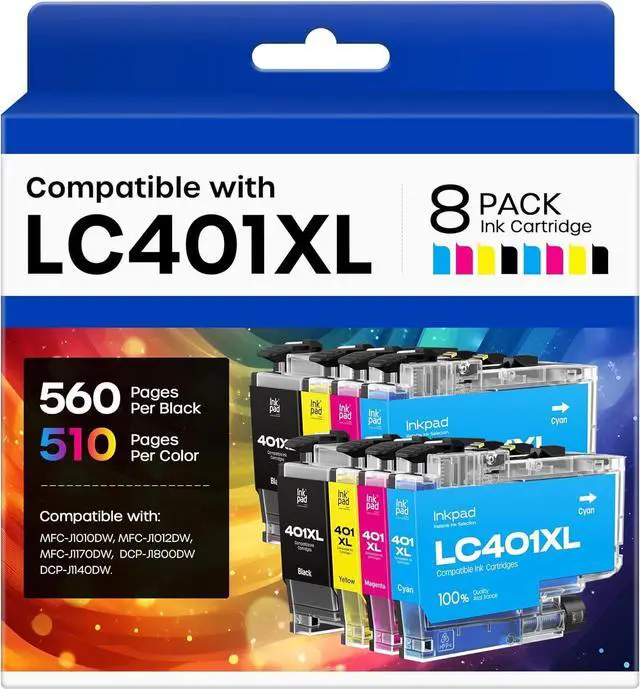Package Included: 8 Pack LC401XL Ink Cartridges Combo Pack(1 x User Guide, 2 x Black, 2 x Cyan, 2 x Magenta, 2 x Yellow)