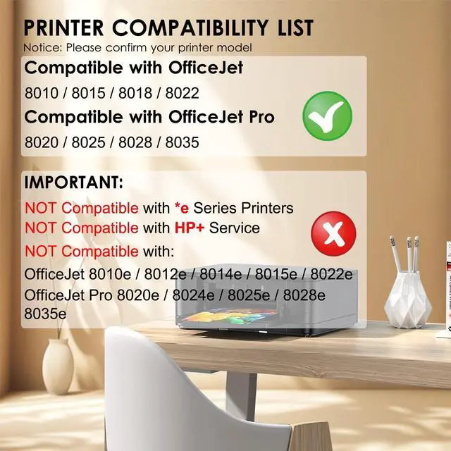 Incompatible with any *e series printers included 8020e, 8024e, 8025e, 8028e, 8034e, 8035e, OfficeJet 8010e, 8012e, 8014e, 8015e, 8022e Printer. If your printer model is one of these printers, please don't purchase our products. they won't work with your printer