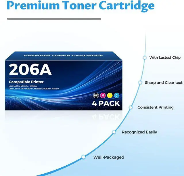 Compatible Printers: 206A Toner Cartridges 4 pack compatible for HP 206A 206X 206 toner cartridges Color Laser Jet Pro MFP M283fdw toner cartridges, Color Laser Jet Pro MFP M283cdw toner cartridges, Color Laser Jet Pro M255dw toner cartridges, Color Laser Jet Pro M255nw toner cartridges, Color Laser Jet Pro MFP M283fdn toner cartridges, Color Laser Jet Pro MFP M282nw toner cartridges