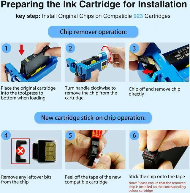 How to Remove the OEM Chips & Install Them on starink Compatible 923 Ink Cartridges 1. Remove the OEM chips from the OEM ink cartridges. 2. Install the OEM chips into the compatible 923 cartridges. 3. Install the compatible cartridges (with the newly fitted OEM chips) into the printer. TipPlease follow the steps in the attached picture A+ or video for chip removal and installation, please contact us if you have any issue during the removal and installation process