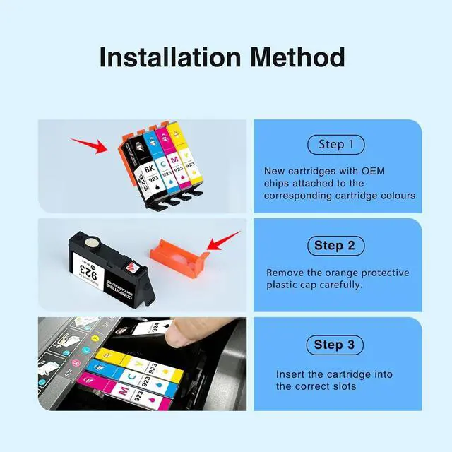 Package Content: 4 Pack 923 Ink Cartridges for Hp Printers and a chip remover tool.Please follow the steps in the attached picture A+ or video for chip removal and installation, please contact us if you have any issue during the removal and installation process.