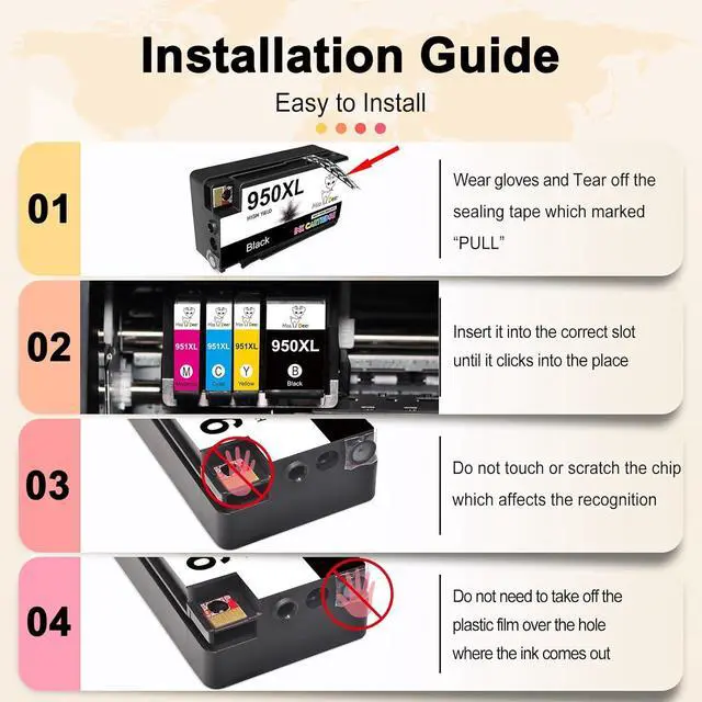 : Miss Deer 950 951 ink cartridges combo pack can be used for copy paper and photo paper. Specially formulated 950xl and 951xl ink cartridges combo pack make sure to print crisp documents and life-like photos. Sharp and smooth, Vibrant color, Prevents clogging