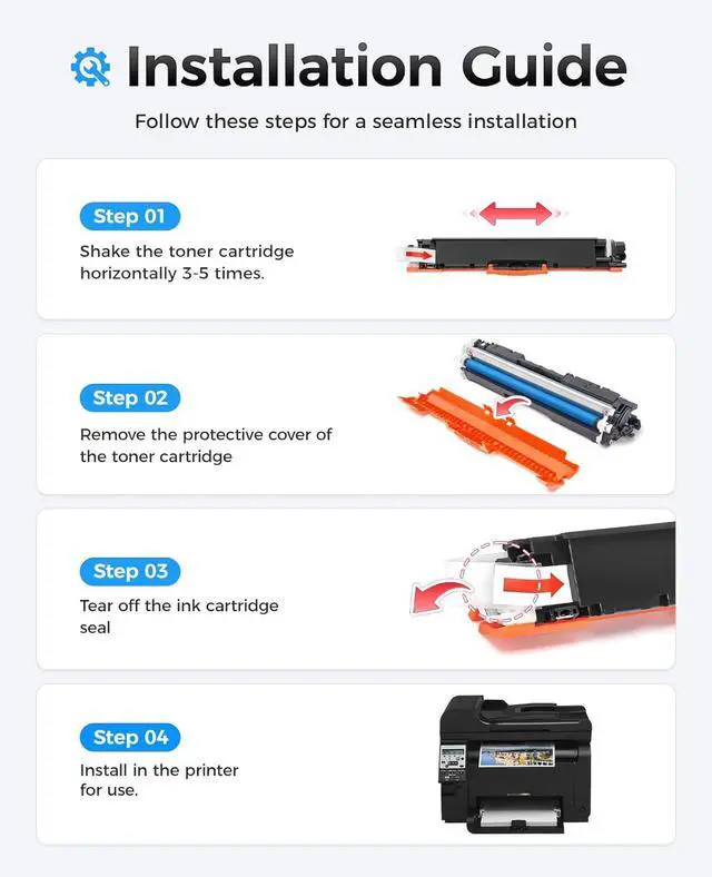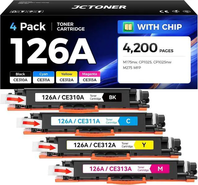 Package Contents: Total 4-pack 126A toner cartridges + 1x user manual, (1*Black 126A CE310A Toner, 1*Cyan 126A CE311A Toner, 1*Yellow 126A CE312A Toner, 1*Magenta 126A CE313A Toner).