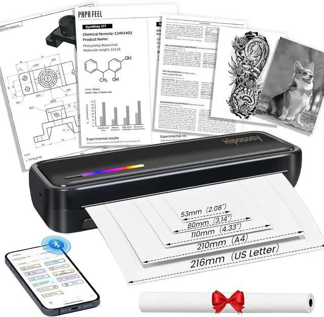 Anywhere PrintingThis portable Bluetooth thermal printer features a 2600mAh battery for 12 hours of continuous mobile use. Ideal for on-the-go printing (travel, office, home, car, outdoors), it handles office documents, contracts, invoices, receipts, delivery notes, boarding passes, engineering drawings, etc. Includes tattoo stencil printing capability with 5 sheets of specialty paper.