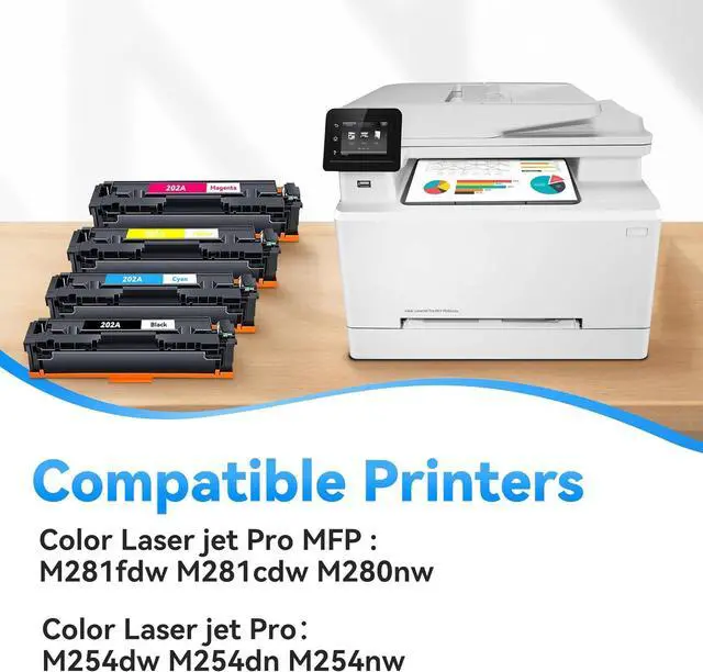 202A Toner Compatible Printers: 202X 202A Toner Cartridges for Color Laser jet Pro MFP M281fdw Works with HP Color Laser jet Pro MFP M281fdw, M281cdw, M280nw, and Pro M254dw, M254dn, M254nw printer.