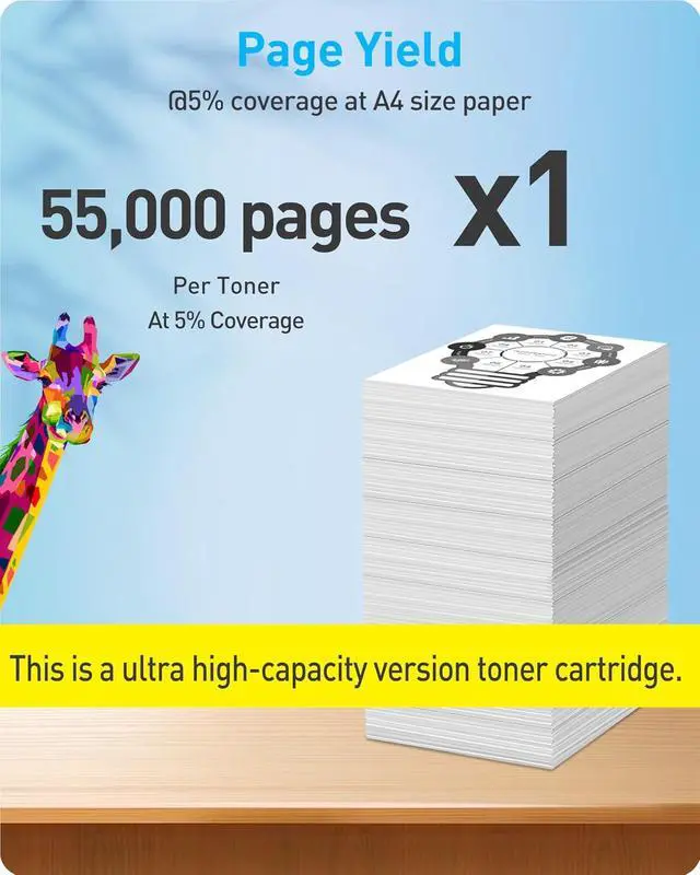 Page Yield: Delivers an extended page yield of up to 55,000 pages at standard 5% coverage on A4-size paper, supporting high-volume printing needs.