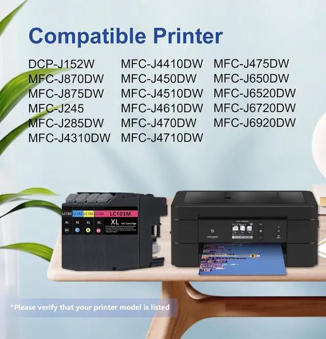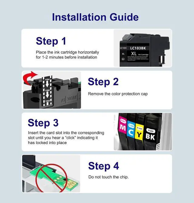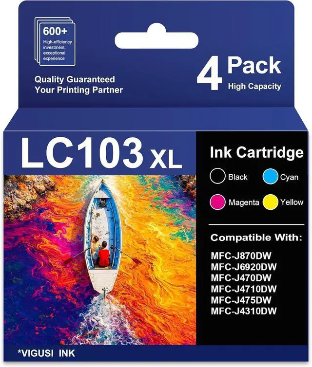 Package Includes: 4 pack LC103 ink cartridge high yield replacement for Brother LC103 LC101 LC103XL ink cartridges(1 x Black LC103XL, 1 x Cyan LC103XL, 1 x Yellow LC103XL, 1 x Magenta LC103XL)